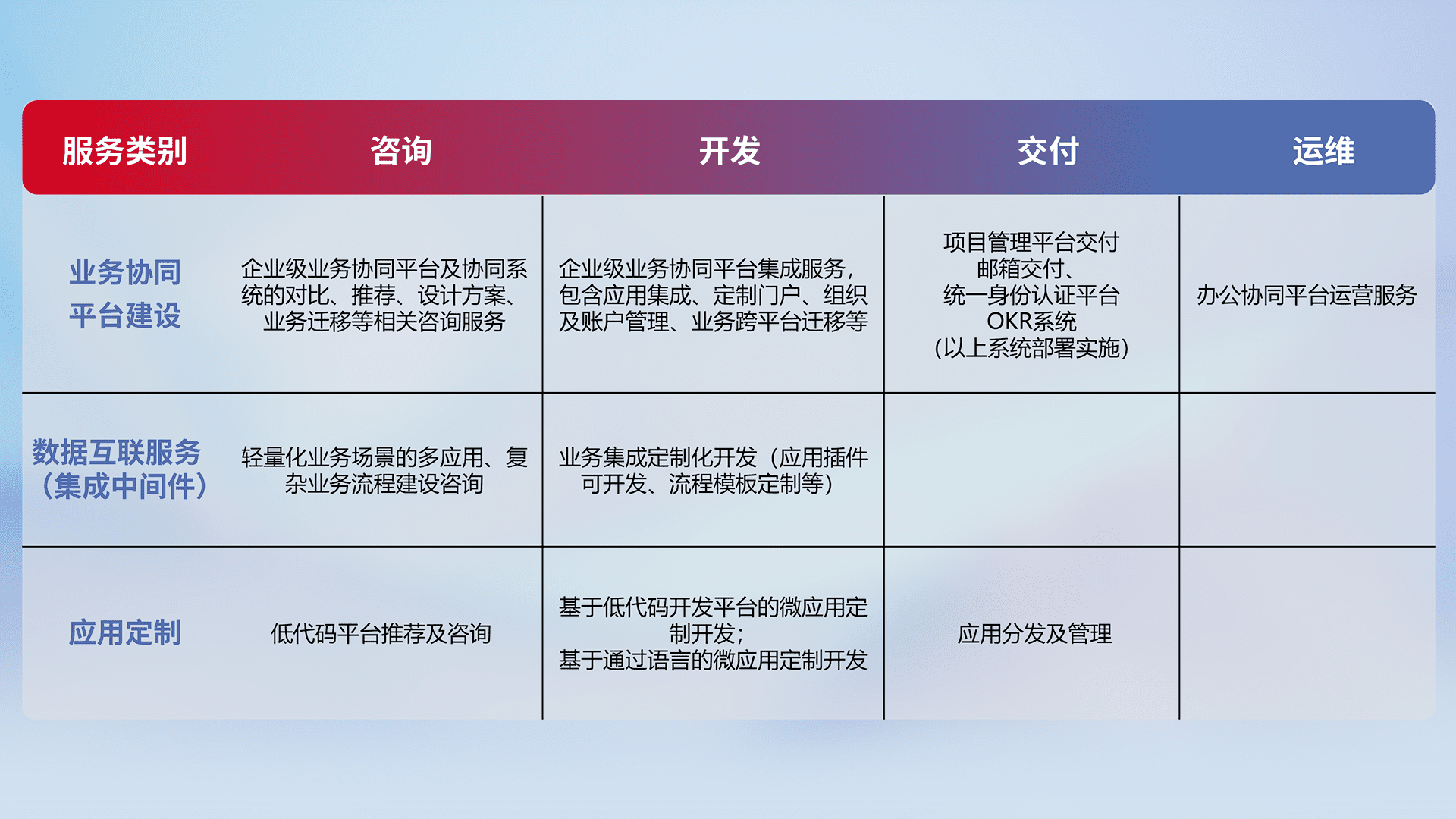 针对钉钉、、、、企微、、、IDaas等平台级产品提供产品的规划、、、方案、、、、交付、、定制化开发等服务,,,,实现如统一协同办公、、、、智能客户服务、、、、混合会议管理、、、智能数据查询、、等业务场景,,,实现数字化转型。。。
